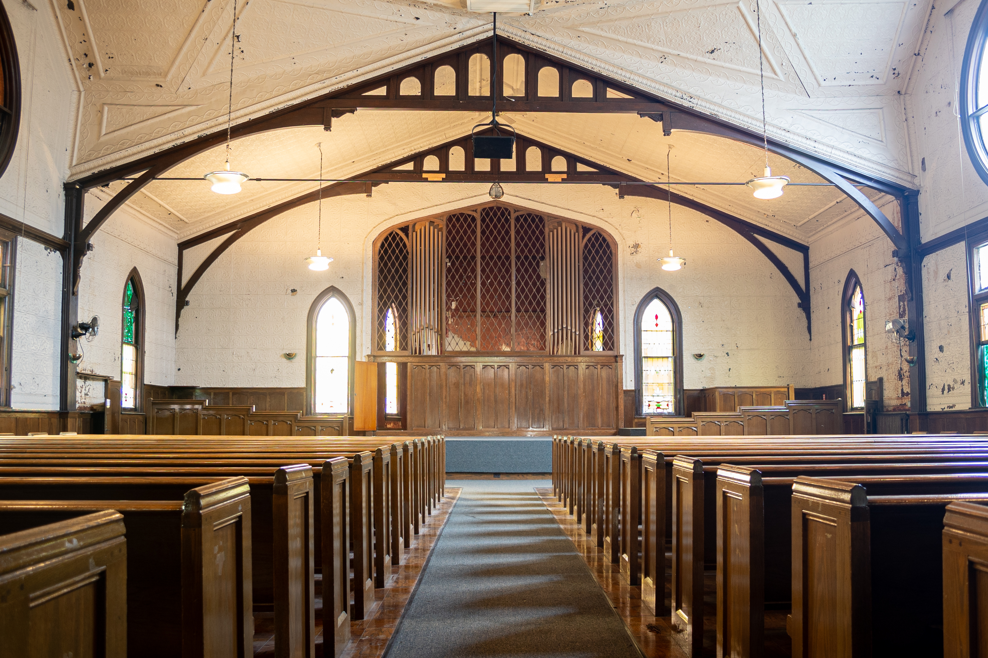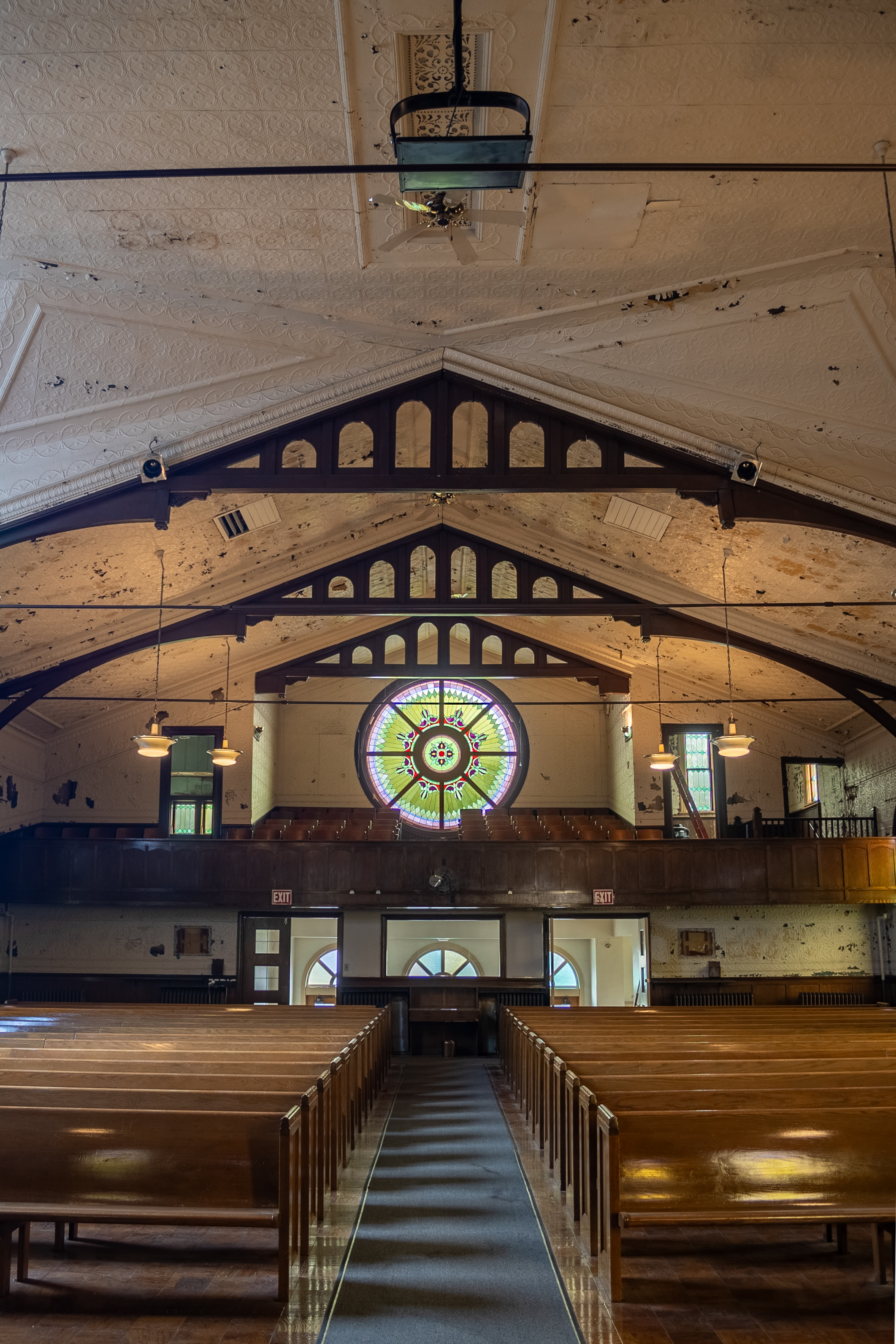 From the exterior, Hermitage at Diamond is notable for its towering steeple and dozens of stained glass windows, including three large (10-foot diameter) rose windows. Inside, it features a 460-seat former sanctuary and balcony with a soaring embossed tin ceiling that contributes to the unique acoustic properties of the space.