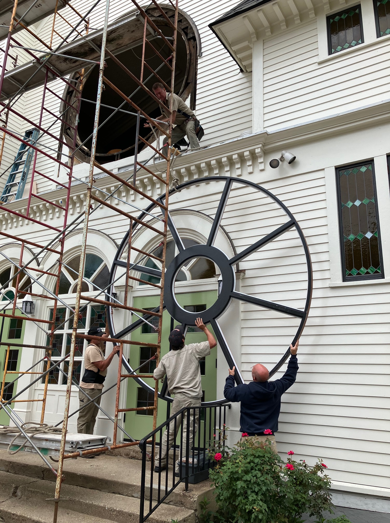 Phase 1 of the restoration project has focused on exterior restoration to protect the structure from the elements before interior work begins. Phase 1 progress to date includes a new roof and cupola, steeple reconstruction including new columns and railings, extensive foundation and siding replacement, exterior painting of a significant portion of the complex, a new concrete driveway, and courtyard landscaping.